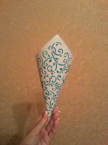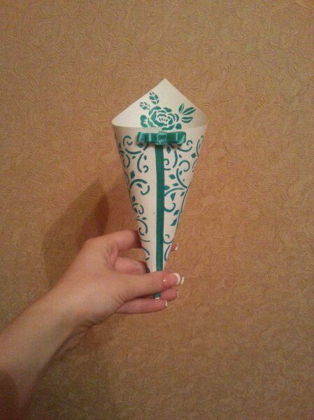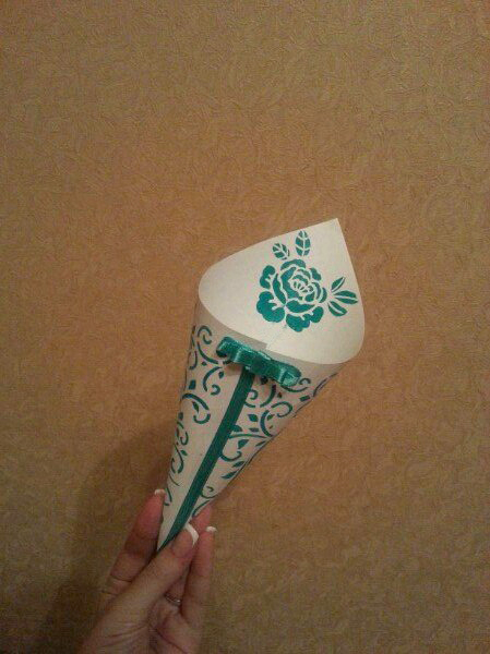 Выбрала бокалы, но они продавались только по 6 штук, и выходило довольно дорого) Но, зато, я теперь точно знаю, какие бокальчики я хочу) Еще попробовала сделать кулечек для лепестков, но это совсееем пробный вариант и он очень неаккуратный..и с цветом слегка прогадала, уж больно яркий получился, в следующий раз больше разведу белым) У меня назрел вопрос а кто какого размера их делал?) Я в нете вычитала, что 15*15 делают, но как по мне, он какой то уж очень маленький вышел) извиняюсь за мою неаккуратность, не было нормального клея) клеила какой то ерундой  как лучше с ленточкой? или без?)