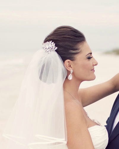 А вот этот пример давольно любопытный, но я бы так низко фату крепить не стала, если фата будет тяжелой, то когда перекинешь слой назад, то будет очень сильно тянуть в низ, прическа может поехать, рискованно, особенно если сами волосы тяжеллые.. Зато в этом примере красиво вставлены заколочки и они будут видны в прически и с накинутой на лицо фатой и когды ее перекинешь.