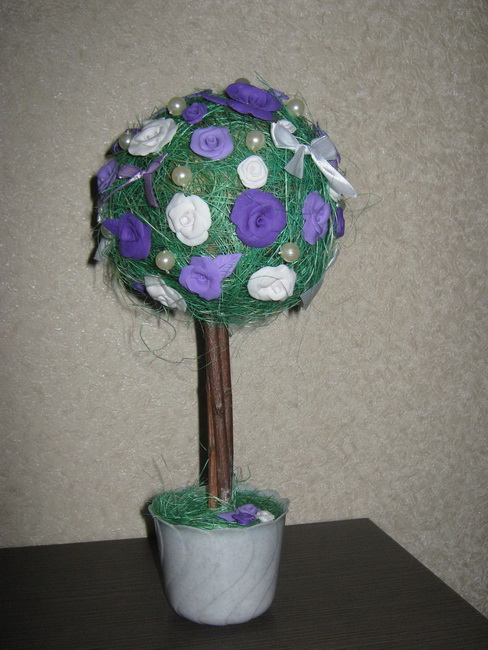 Еще доделала топиарию и теперь она украшает тумбочку ( на свадьбе использоваться не будет) Вложение: