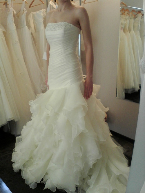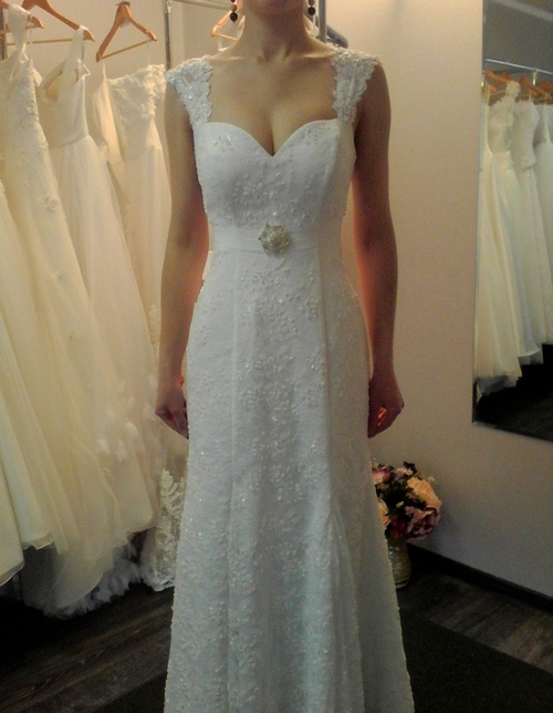 Самая замечательная новость: мне очень идут НЕпышные платья!!!! Это точно моё, я себя почувствовала такой... дорогой, что ли... в пышных было ощущение, что я очень юная, в этих - что я такая элегантная, девушка с тонким вкусом... не знаю, какими еще словами передать... Успела примерить только два, Леонор - шикарное кружевное платье и второе с воланами - название не помню... пофотографироваться успела только в первом нормально, второе зашнуровали, и тут приехал БМ на встречу - сделали пару снимков, и я побежала прятаться в примерочную. Еще одно хотела - не успела((( Фотки показала маме, она, конечно, не очень довольна, потому что все еще хочет видеть на мне пышненькое, но мне уже надоело всем уступать... в случае с платьем - последнее слово будет точно за мной... Так вот, девочки, я в полной растерянности... мне понравилось очень кружевное. Мама - за воланы... считает, что надо посмотреть еще где-то с воланами или взять это, если я настроена на облегающее платье... мне кажется, что все потому, что воланы хоть немного "пышненькие"... эти - еще и в шлейф переходят, да, очень эффектный... но я смотрю на кружевное, и понимаю, что это именно такое, как надо! Не хотела выкидывать сюда фотки, пока не сделаю окончательный выбор, но сейчас мне нужна ваша помощь - мнение со стороны: правда ли воланы лучше или мне больше идет кружевное? Нужен ваш совет, чтобы в дальнейшем не рассматривать неподходящие варианты, если что...