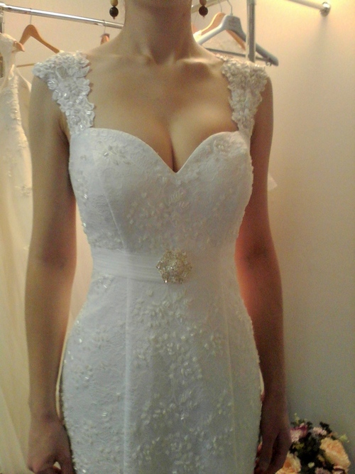 Самая замечательная новость: мне очень идут НЕпышные платья!!!! Это точно моё, я себя почувствовала такой... дорогой, что ли... в пышных было ощущение, что я очень юная, в этих - что я такая элегантная, девушка с тонким вкусом... не знаю, какими еще словами передать... Успела примерить только два, Леонор - шикарное кружевное платье и второе с воланами - название не помню... пофотографироваться успела только в первом нормально, второе зашнуровали, и тут приехал БМ на встречу - сделали пару снимков, и я побежала прятаться в примерочную. Еще одно хотела - не успела((( Фотки показала маме, она, конечно, не очень довольна, потому что все еще хочет видеть на мне пышненькое, но мне уже надоело всем уступать... в случае с платьем - последнее слово будет точно за мной... Так вот, девочки, я в полной растерянности... мне понравилось очень кружевное. Мама - за воланы... считает, что надо посмотреть еще где-то с воланами или взять это, если я настроена на облегающее платье... мне кажется, что все потому, что воланы хоть немного "пышненькие"... эти - еще и в шлейф переходят, да, очень эффектный... но я смотрю на кружевное, и понимаю, что это именно такое, как надо! Не хотела выкидывать сюда фотки, пока не сделаю окончательный выбор, но сейчас мне нужна ваша помощь - мнение со стороны: правда ли воланы лучше или мне больше идет кружевное? Нужен ваш совет, чтобы в дальнейшем не рассматривать неподходящие варианты, если что...