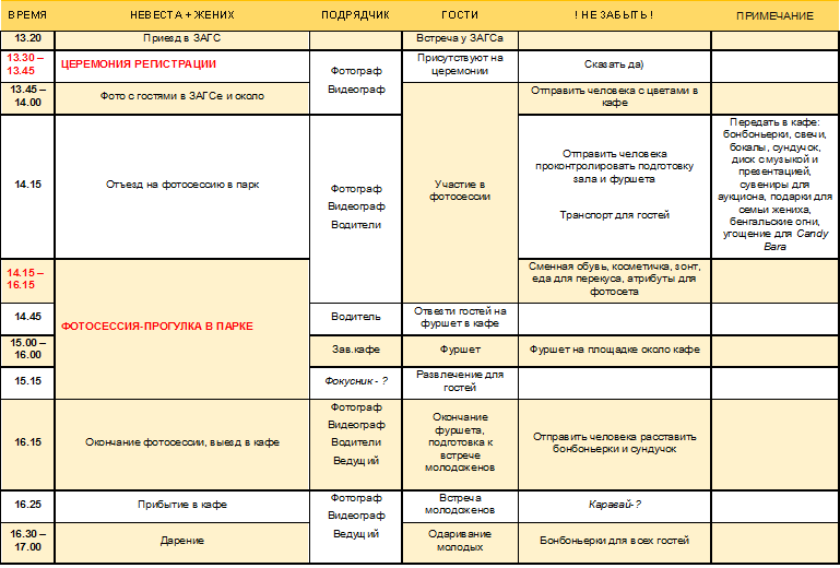 Basya, спасибо за идеи Теперь понятно, что не стоит тратить время на детальное обсуждение конкурсов при первой встрече Думаю, достаточно будет оговорить что мы точно хотим, а что точно не хотим И послушать как он проводит традиции и при необходимости "скорректировать" под нас nastena13, вся аппаратура+ди-джей (еще и поет сама) у нас входит в аренду кафе  , так что минус один подрядчик для поисков) nastena13, natali-aix13 - время Это точно, что надо прояснить и оговорить это И музыка тоже - важный пункт!! Спасибо вам огромное Я уже набросала примерный план-тайминг нашего дня  , думаю стоит и его прихватить на встречу, может что-то посоветует Кстати, тайминг такой подробный у меня получился Может позже выложу его сюда, думаю полезно будет и для меня и для других) Скорее бы суббота