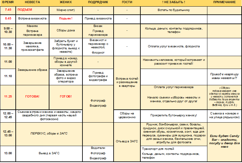 Basya, спасибо за идеи Теперь понятно, что не стоит тратить время на детальное обсуждение конкурсов при первой встрече Думаю, достаточно будет оговорить что мы точно хотим, а что точно не хотим И послушать как он проводит традиции и при необходимости "скорректировать" под нас nastena13, вся аппаратура+ди-джей (еще и поет сама) у нас входит в аренду кафе  , так что минус один подрядчик для поисков) nastena13, natali-aix13 - время Это точно, что надо прояснить и оговорить это И музыка тоже - важный пункт!! Спасибо вам огромное Я уже набросала примерный план-тайминг нашего дня  , думаю стоит и его прихватить на встречу, может что-то посоветует Кстати, тайминг такой подробный у меня получился Может позже выложу его сюда, думаю полезно будет и для меня и для других) Скорее бы суббота