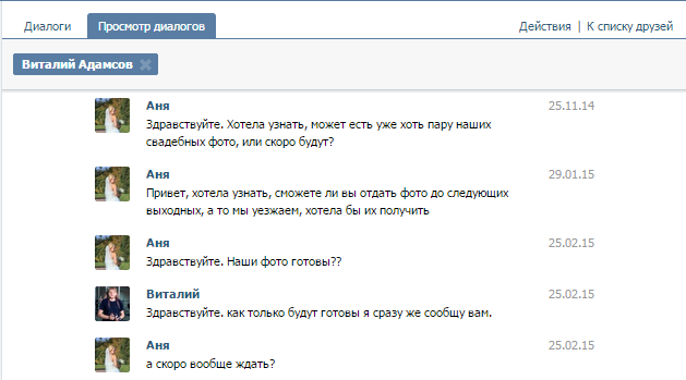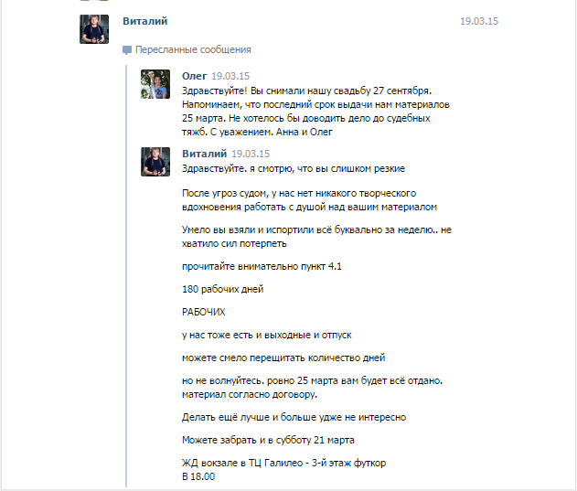 Хочу оставить свой отзыв о работе свадебного фотографа Виталия Адамсова. Начну с того, что скажу, что выбирали мы долго, и очень обрадовались, когда наконец, нашли то, что искали. Тогда мы думали, что сделали правильный выбор. До свадьбы и на свадьбе все было неплохо. К работе в процессе претензий мы не имели. Хотя никакой атрибутики нам не было предложено (хотя в других альбомах мы ее видели). Но это не важно. А вот после свадьбы начался полный игнор и свинское отношение к своему клиенту. Человек, который работает на себя, ведет себя так, будто ему абсолютно плевать на заказчика. У нас в договоре указан срок изготовления фотографий 30-180 рабочих дней. Но те, у кого были свадьбы в недавнем времени, прекрасно знают, что люди не тянут обычно до последнего дня. И большинство фотографов отдают хотя бы ПАРУ фотографий уже через неделю-другую, ведь этот день очень важен для молодоженов и фотографии соответственно, как воспоминание о нем. Но тут - зачем? Через 2 месяца я попросила хоть НЕМНОГО фотографий, и не получила даже элементарного ответа!!! Просто уважения к себе. (Ниже прилагаю фото своим вопросом «вникуда»). Также должна отметить, что когда я или мой муж звонили по телефону, попадали на голосовую почту, т.к никто не брал трубку и так много-много раз. Само собой, перезвонить Виталий не считал нужным. НИ РАЗУ. Однако через 3,5 месяца моему мужу 1 раз удалось дозвониться, и он сказал, что осталось 3 недели до готовности нашей свадьб, и мы воодушевились в надежде получить фотографии. Т.к. мы уезжали на 2 недели, я перед отъездом снова обратилась к Виталию с просьбой получить фото, пока мы не уехали (три недели к тому моменту прошло), но снова - молчание было мне ответом. Но телефону -снова никто не брал трубку. И вот спустя 5 месяцев от нашей свадьбы, когда мы уже давно вернулись из свадебного путешествия, никто нам не писал и не звонил, я обратилась снова. Ответ все в той же фотографии ниже. На вопрос когда? – потипу ждите, и вам сообщат. Очень «приятно», как вы понимаете, такое отношение. Еще через месяц, когда терпению приходил конец и в первую очередь от отношения, когда человек даже не удосуживается сказать, сколько нам ждать или прислать по интернету хотя бы малую часть!, когда не удосуживается снять трубку или перезвонить, мой муж написал ему очередное сообщение. (переписка приведена ниже.) Как видно, фотограф сразу нашел время нам ответить, а ведь до этого он как будто не видел наших звонков и сообщений. А тут не прошло и минуты… В итоге, мы получили фотографии 21 марта, как указано, однако т.к он «ОБИДЕЛСЯ», обработанных фотографий было лишь 25, а всего 422. (указано до 1000)-мне не нужно было ровно 1000, но среди этих фотографий не было многих элементов зала, на дарении не все запечатлены, во время первого танца всего пару фото и т.д. Ведь на свадьбе важно ВСЕ, каждый элемент. Все фотографии, по мнению фотографа, готовы к печати, однако лица обработаны только на 25 фотографиях и это работа, которая требует полгода?!! Когда я прихожу домой, получив фото, и доделываю их!! Где раздражение, где прыщ… А еще, оказывается, платя такие деньги, я не заслуживаю получить ВСЕ ФОТО на диске. Оказывается, что 50 фото не влазит и поэтому я получаю их на СВОЕЙ флешке, а если хочу на диске должна 50 фото удалить! У всех, кого я спрашивала, у кого были свадьбы, давали столько дисков, сколько нужно. 2 дв
