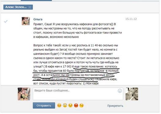 Первые пять претензий я написала фотографу, ниже прилагаю нашу переписку, чтобы не быть голословной. С остальными уже ничего не поделаешь, к сожалению. 3. По поводу напарника:На нашу свадьбу Alex Зеленко попросил взять напарника, со словами «вам это ничего не будет стоить, человек потренируется, а вам будет в 1,5 раза больше фоток». В итоге, мы об этом очень сильно пожалели. Напарника он взял, но вот фото от напарника мы так и не увидели. Мы пытались добиться этих фоток с конца ноября 2012, когда забирали наши, до января 2013. Фото Алекс Зеленко так и не отдал (подробности смотрите в переписке в конце отзыва). 4. По самому свадебному дню и содержанию фото:В сам свадебный день мне казалось, что все идеально… Просто мне хотелось так думать. Кое-что в поведении нашего фотографа Alex Зеленко, нам не понравилось 1) Нет ни одной фото как мы выходим из подъезда, рассаживаемся по машинам 2) Пока мы ходили по парку, он все время шел далеко впереди со своим напарником... 3) Когда мы в парке вернулись к гостям и сестра мужа попросила нас сфоткать, фотограф сказал, что будет фоткать нас в столовой и мы очень опаздываем, хотя мы были не против сфоткаться с гостями на природе. Так что фоток с девчонками у меня, как и фоток мужа с парнями у нас нету . Вообще к концу свадебного дня у меня просто сложилось впечатление, что он хотел просто как можно быстрее от нас свалить. 4) Нет фоток как мы приехали в столовую. Зеленко ехал на другой машине и приехал раньше нас. Но сразу убежал наверх (при том, что за день до свадьбы, я сказала, что хочу сфоткаться на К.Маркса (у нас там была столовая)). Моему дяде почему-то ни дождь, ни холод не помешали дождаться нас и сфоткать как мы приехали. 5) У меня нет ни одной фото меня со сборов невесты. Алекс Зеленко сказал, что меня фоткал напарник, фотки напарника «типо» вышли плохого качества и все… Фото аксессуаров тоже нет, хотя все лежало вместе и подвязки и кольца и свечи… Специально все было выложено на полочку около зеркала. А я обращала внимание именно на сборы! Что я хочу чтобы обязательно сфоткали как меня красят, мои аксессуары !!! Но фотограф просто проигнорировал мои просьбы.5. Из послесвадебного общения:Фотограф наотрез отказывается признавать свои ошибки, а еще и пускается в оскорбления (см. ниже в переписке). Я выкладываю сюда фото нашей переписки, просто чтобы вы могли объективно оценить ситуацию (на первом читать снизу вверх ). Вложение: