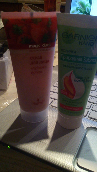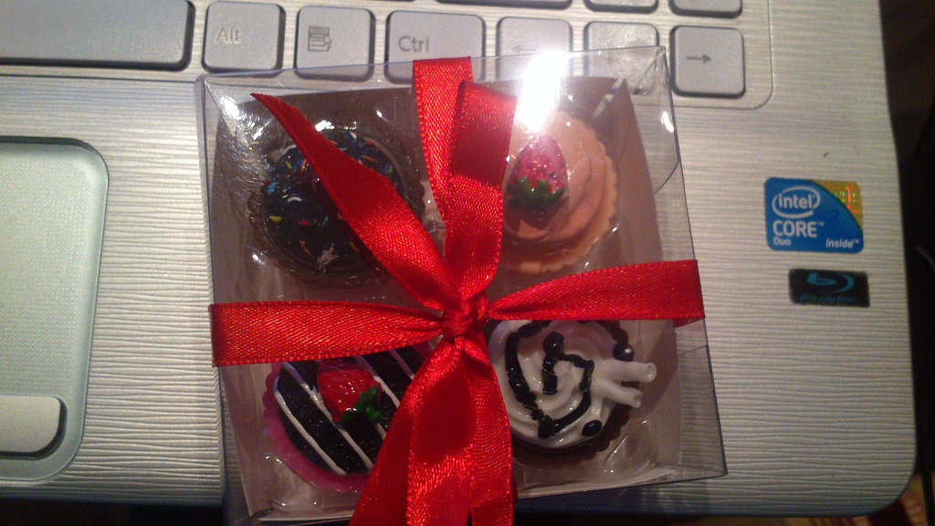 Моя снегурочка(точнее дед мороз), можешь не переживать. С этой суматохой из-за кредита, подарочек я забрала только сегодня. И так когда я увидела коробочку первое, что бросилась в глаза это бантик)))) открыв ручкой посылку, я увидела вторую милую милую коробочку и пожелание от деда Мороза))) и так что то внутри передвигалось))) я очень аккуратно пыталась открыть, что бы не порвать, но порвать все равно пришлось( муж очень удивлялся))) и подгонял меня!))) ему тоже было безумно интересно! и не поверите) сняв упаковку, коробочка была обклеена белой бумагой, и тут я дала шанс мужу)) Он прям за рулем начал срывать эту бумагу что бы открыть. Внутри мы обнаружили скраб для тебя и крем для рук. но потом я обнаружила маленькую коробочку с бантиком!!!!!!!!! О боги это были маленькие пирожки-мороженое!!!! Я прям мищала от восторга, я крутила вертела в руках. Муж с меня смеялся) Огромной спасибо Катюш за подарок!!!! очень очень понравилось!!! Счастья доставила не только мне, но и мужу)))