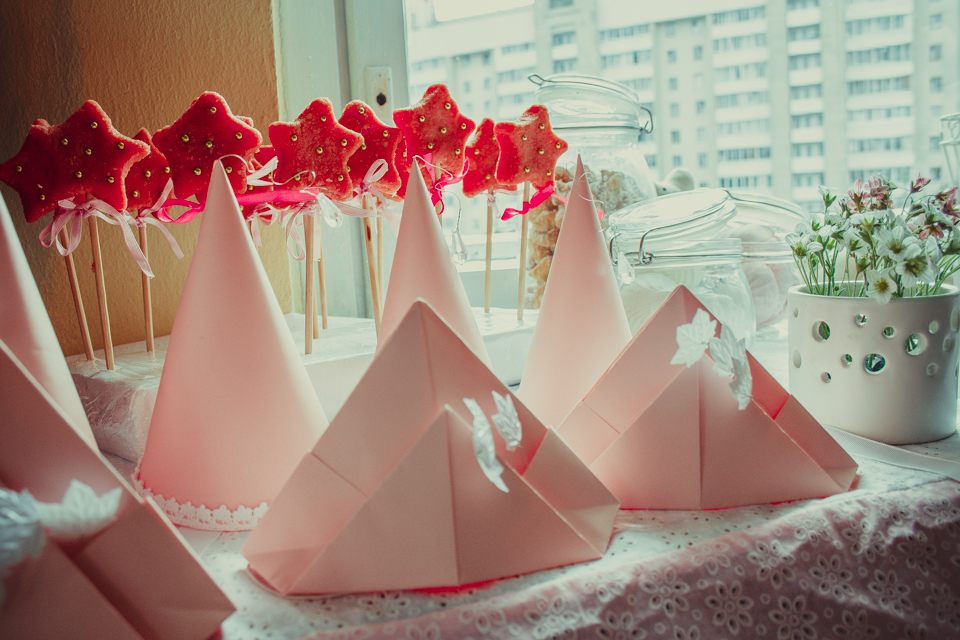 моя дочка, как и многие очень любит платья, принцесс и фей, поэтому в прошлом году, ей исполнилось 3 года, по ее просьбе, я делала в стиле розовой феи) был десерт на палочках ввиде волшебных звездочек, торт с феями, колпачки для девочек и мальчиков, крылья и ,конечно, приходила в гости главная фея