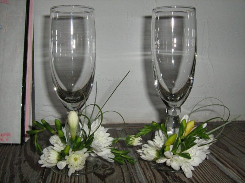 В бокалах я бы украсила только низ. Примерно так. Только в цвет свадьбы.
