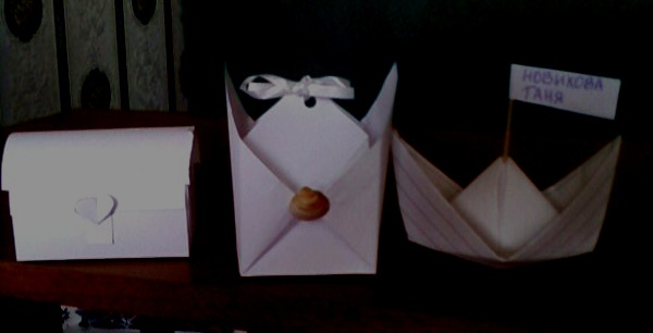 Помогите плиз еще выбрать бонбоны: сундучок или штука похожая на кораблик. Это пробные варианты из обычной бумаги, естественно, все будет другого цвета. Справа карточка рассадки в виде кораблика