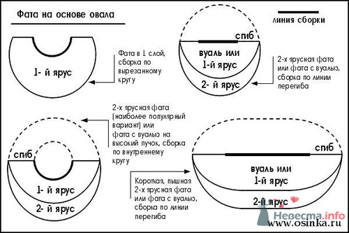 на фото обычный прямоугольник, собранный сверху. Никакой обработки. Фатин не осыпается, поэтому и необработанный край будет смотреться аккуратно. Еще фатин бывает самый разный. Если хочется непышную фату, нужно брать мягкий очень нежный фатин, если пышную - тогда более жесткий фатин