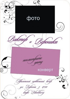 Тогда отложим рассадку на самый-самый конец)) Подумаю об этом 23 сентября))) Нарисовав три макета пригласительных я вроде бы успокоилась и остановилась на последнем. Идейку украла на каком-то сайте. Конверты я уже распечатала и даже вырезала, они светло-сиреневые (получается цвет все же фиолетовый  ) по поводу узоров сомневаюсь, оставить их черными или сделать побледнее) Веду подсчеты сколько нужно цифАр вырезать и сколько метров ленты купить)) Ах, ну и романтическое фото надо забацать