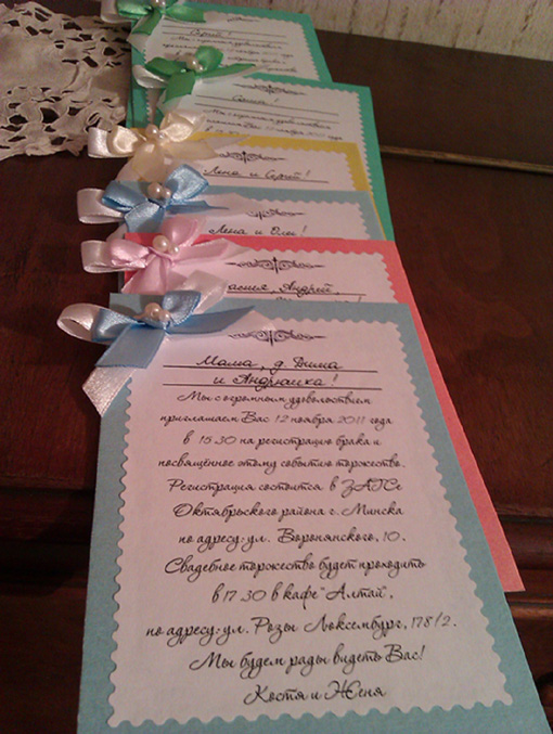 Квадратка, спасибо!! БМ оказался у меня романтиком...  Предложение для меня было ожидаемым, но таким неожиданным и крутецким!!! Мы сами, если честно, приглашалками очень гордимся  Тем они, наверное, и прикольные, что цветов разных. Многие из приглашенных радовались цвету приглашения не меньше, чем ему самому Я совсем не чувствовала себя неветой (даже когда платья свадебные примеряла) до тех пор, пока не сделала первое приглашение. Вот тогда и поняла, что ВСЁ!!!
