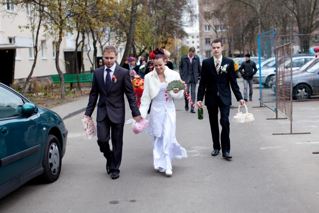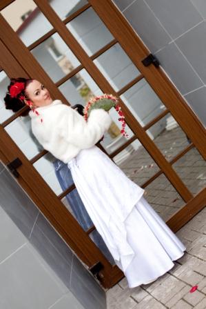 Часть третья - морозная свежесть Поехали мы значицца, на фото сессию. Но перед эти нужно было заскочить, куда бы вы думали???? Ну конечно же на РЫНОК!!!! Любимка хотел один быстренько метнуться туда по делам и все, но не тут-то было ))) Он же женился не на ком-нибудь, а нам МНЕ  Естественно, я ломанулась следом за ним  Как на нас народ реагировал!!!!!!!!!!!!!!!! Это просто финиш!!!!!!!!!!!!!!! Я такого не видела!!!!!! Позравляли все подряд, удивлялись и хотели сфоткаться ) Кароч, я была звязда! Ой, вернее мы  Хотя нет, я больше )))) Единственное, о чем жалею, что фотограф осталась в машине, а так можно было бы сфоткаться, как мы на рынке подгузники выбираем )))))))))) Потом заехали к свидетелю домой, ведь у любимого не было куртки или пальто. А в одном костюме можно коньки было отбросить от холода. Далее наш путь лежал к минскому морю. И как вы думаете, мы туда поехали??? Ан нет. Мы поехали в макдональдс, бо жутко хотелось есть  Наши свидетели и фотограф, сидя сзади, начали строчить смс-ку на русское радио с поздравлением втихаря от нас, но милый все понял и эффект неожиданности пропал ) Но как можно идти кушать, когда мы не услышали поздравления? Ответ один - макдрайв! Мы ухохатывались с лиц работников сего заведения, но под громкие требования свидетельницы, они нас поздравили и вручили кучу флажков, которые потом ловили по всей машине. Нужно ли говорить, что во время езды на нас оборачивались все люди, апплодировали нам и кричали? Думаю, стоит ))) Две бабульки даже на пешеходнике чуть не стали ) Когда по радио играли песенки, в машине опускались стёкла и мы со свидетельницей и фотографом высовывали руки в окна и оралиииииии ))))))) При этом прося, чтобы в машине включили печку посильнее, бо холодно )) Благо, у меня была сидушка с подогревом, поэтому моя попка всегда была в тепле, как и спинка ) До моря мы все-таки не доехали, но какую-то водичку нашли. Там и решили пофоткаться, какая разница, минское это или нет? Короче мы там задубели, ка черти. Зато позитивом зарядили так, что мамадорогая (именно одним словом)) ) Меня там и на плече таскал любимый, и на беседке я повисела, и боевую раскраску милому сажей на лице сделали (надеюсь видно будет на фотках), и за машинкой я побегала, и в мэри поппинс поиграла. Кароч оторвались мы. Потом со словами да ну нафиг тут холодно, дружно понеслись в машину. И подогрев седушек снова меня ублажал  Поехали на минск-арену. Подурачились тама. Хотели зайти внутрь и пофоткаться, но никто не захотел денег заработать, посему мы плюнули на это дело и снова бегом в машину. Сколько работать фотографу с фотожопом - это уму не постижимо. Ведь чтобы убрать с фоток наши красно-синие носы и такого же цвета руки - нужно постараться ))) Тогда поедем в оперный, раз записались, решили мы. Но предварительно заехали в магазин, решив, что в кафе забыли купить кофе с чаем. В этот момент мне звонит Лена и говорит, что в кафе все ещё сидят посетители и никто не чешется их выгонять и накрывать на столы!!!! Я за часы, а там - почти половина четвертого!!!! Это с учётом того, что гости приглашены к пяти!!!! Я говорю Тохе про это. Он садится на коня и мы едем в кафе, благо стояли минутах в трех от него. Прилетаем туда, ведущий в шоке, Лена расстроенная, что вызвала нас, я злая и все равно ловлю кайф, а любимка понёсся к администратору прихватив с собой КАТАНУ )))) Как они шуганулись )))) В общем, через 10 минут посторонн