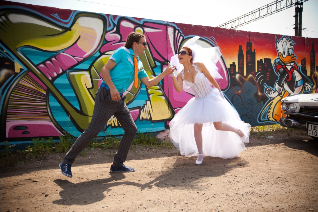 Из дома мы сразу поехали на фотосет 1: стена, граффити, парк Горького. Ехали мы в разных машинах, но рядом со мной были мои самые близкие - лучшая подруженька (она же свидетельница) и младший братик (который на младшего уже не смахивает). По дороге были оч смешные моменты. Мне крестная должна была передать матирующие салфетки, но так сложились обстоятельства, что мы не пересеклись, а когда ее муж приехал к нам домой, мы уже выезжали! и тут начался настоящий Нид фор спид :mrgreen: В общем, Александр догнал нас на каком-то перекрестке и в прямом смысле слова зашвырнул эти салфетки в салон машины :mrgreen: :mrgreen: Интересно было наблюдать за реакцией прохожих на 1ю нашу машинку)) один дядя так выворачивался, что чуть не упал :mrgreen: