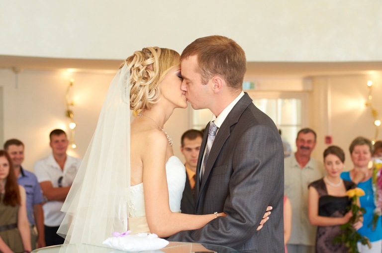 Около ЗАГСа я увидела недошедших до выкупа двух человек и была очень счастлива, что они пришли!) Настроение у меня стало еще лучше. В ЗАГСе мы побыли в комнате жениха и невесты и после регистратор сказала : «Когда услушите музыку-входите». И вот мы стоим перед дверьми, держась за руки… начинает играть Марш Мельденсона, двери открываются и перед нами огромное красивенное помещение….(я то раньше во Фрунзенском ЗАГСе не была, не ожидала, что он на самом деле такой симпотичный) все сверкает и блестит…. вот тут то и начали дрожать мои коленки, ручки вспотели и пришло волнение. Очень приятная женщина-регистратор произносила речь, говорила всем знакомые слова, но для меня они звучали как-то особенно, стоя там я понимала, насколько важны эти слова! Я то и дело отводила взгляд на разные предметы, чтобы не заплакать и кусала губы…И конечно на походе был вопрос, который меня немного отвлек: «Согласны ли вы…..», а в голове только одна мысль: «как бы красиво сказать «ДА!», не пискнуть, не промямлить, ну и не как в армии)) Ну вроде получилось мое да очень даже неплохо) обмениваюсь кольцами, я заметила, что и муж тоже волнуется, хотя у меня волнение уже сходило… нам надарили цветов, потом мы побыли в комнате шампанского и поехали на фотосессию…. Жара 35+…. «Как же нам «Повезло»-думаю я))