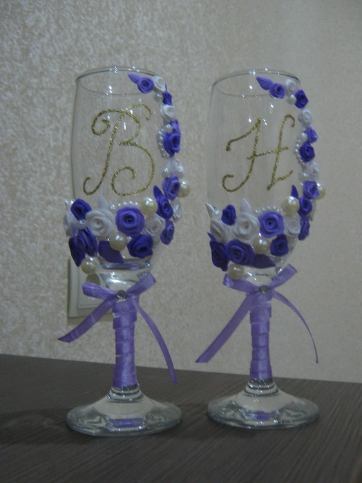 tivatien При желании ножку возможно разматать, т.к. лента на клею, инициалы нанесены золотыми блестками и в живую смотрятся лучше чем на фото. Есть у меня еще одна запасная идея (без роз вообще), нужны будут новые бокалы, возможно воплощу. А вообще ваше мнение для меня ценно