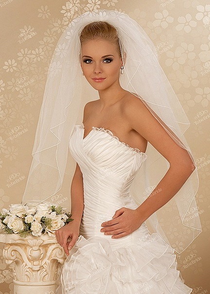 Irina Vladimirovna, я к такому платью вижу так называемую фату-американку: трехслойный вариант с необработанным краем, когда все слои одной длины, примерно до талии или копчика, что то похожее на картинку ниже, только немного пышнее и воздушнее: