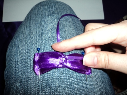 Для удобства лучше всего прикрепить бантовую ленту к какой-нибудь поверхности с помощью булавок.