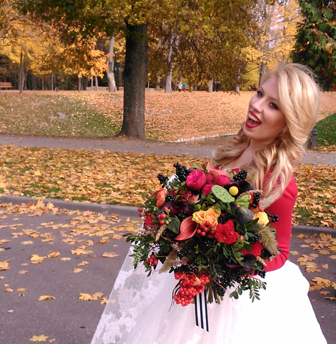 Накануне съемки я волновалась почти как в день свадьбы, нужно было съездить утром за букетом, сделать прическу, макияж одеться, собрать мужа, встретить фотографа и выехать по раньше. Утром я встала по раньше в часов 6, собрала оставшиеся пакеты, сделала половину макияжа, бутерброды с собой и поехала к Оксане Орловой за букетом) помимо букета я еще заказала бутоньерку и венок. Все было нереально красивое, волшебное, осеннее))