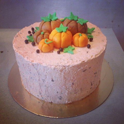 Торт я заказывала маленький покрытый белой мастикой и сверху оранжевые тыквы с листиками, идея была такая, я просила повторить: