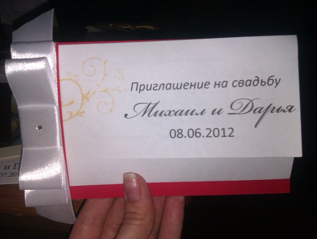 Lyolya, спасибо! Пригласительные заказывала в срочном порядке, поэтому о цветах особо не раздумывала. На выбор была красная, малиновая, фиолетовая, бежевая, серая и, кажется, прозрачная основа. А лента, как раз, мне белая приглянулась. Хотя я даже не подумала о другом цвете, может, ты и права. Но, наверное, уже поздно)