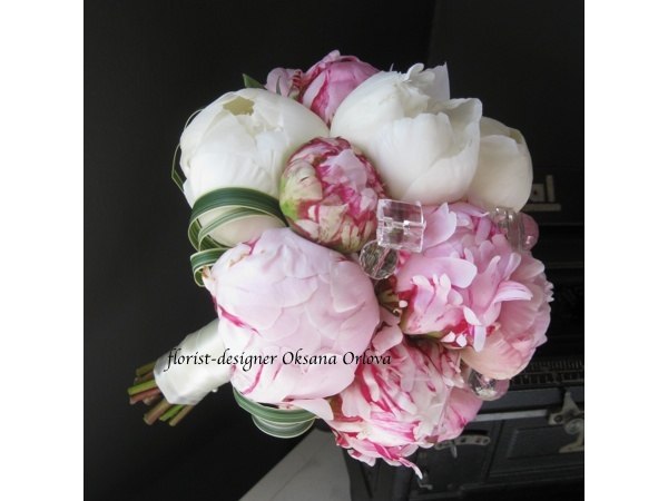 Ты хочешь букет из пионов? Фиолетовых пионов конечно не бывает, поэтому возможно включение и других цветов в букет, например, белый пион+фиолетовые цветки. Посоветуйся с флористом по поводу цвета, если свадьба розовая и фуксия- бело-розовый букет из пионов смотрится прекрасно и не вульгарно. Вот например букет Оксаны Орловой, прекрасный вариант...