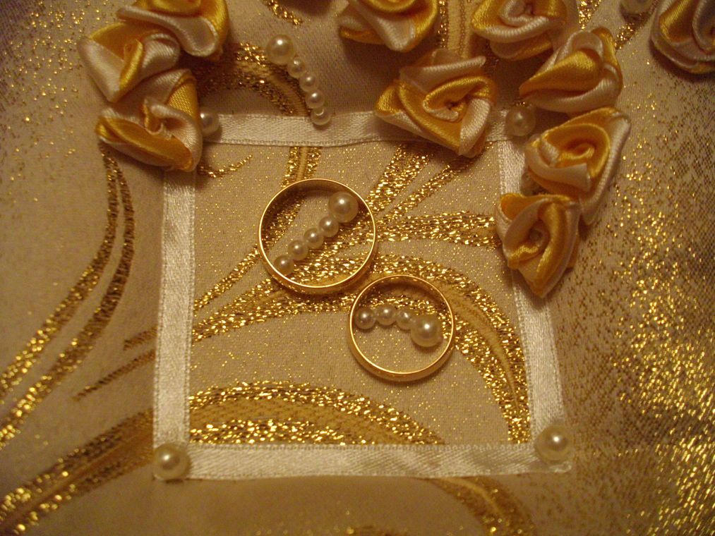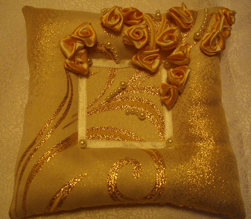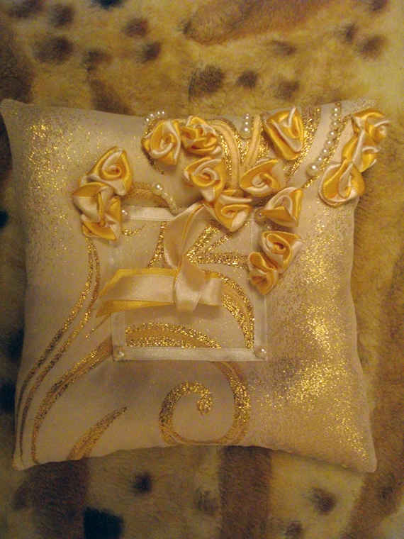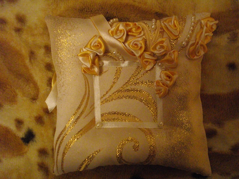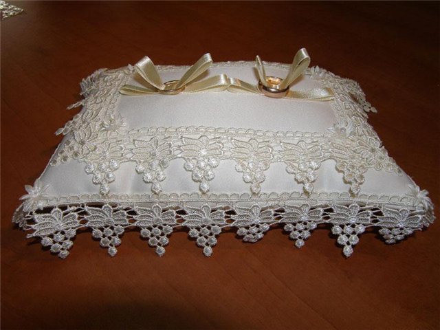 Девочки, вчера почти доделала подушечку для колец. Но у меня тупняк. Не могу придумать как кольца цеплять. Планировала на ленточки привязать, но чтото мне уже так не нравится. Хочу эти ленты обрезать. Есть несколько вариантов: -просто кольца положить в углубление - пришить в середину розочки, но меньшего размера и положить на них кольца, розы как бы внутри колец подучатся - тоже, что и предыдущий вариант, только вместо розочек-бусинки - ленточки полностью не срезать, а укоротить, посередине углублния ленточки пришить, оставить маленькие хвостики, к которым приклеить магнитики на кончики (у меня есть магнитики кругленькие маленького диаметра.), и как бы туда прицепить кольца. - ваши варианты Тут ленточки просто болтаются Вложение: