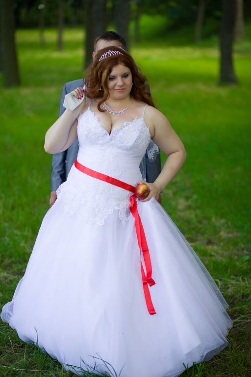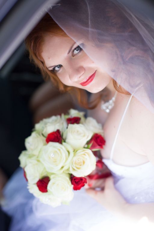 Пятница… Наверное как у всех невест это самый суматошный день… В пятницу я не выпускала телефон из рук, а мужа от себя… Мы докупали фрукты и всякую мелочь и самое обидное я не могла на свою ногу подобрать балетки, что меня мягко сказать выводило из равновесия, но всё таки я их нашла чему была несказанно рада!!! Вечер выдался не лучше, нужно было съездить за тортом и отвезти все продукты в кафе… Приехав домой мы начали собирать все пакеты… Это был ужас… С горем пополам сделали, а всё что не успели по мелочи отложили на следующее утро т.к. от всей суеты я не чувствовала «задних ног»…. Суббота… Проснулась я раньше всех в т.ч. и будильника… В бешенном ритме мы начали собираться… Голову мне пришлось мыть за 15 минут до выезда (квартиру для свадебной съемки мы снимали) т.к. не успевала помыть голову мне пришлось её сушить уже на ходу (водители наверное были в шоке)… Поесть я не успела… Опоздали мы минут на 5 и когда приехали Марина Датькова (парикмахер) нас уже ждала около подъезда, а мой муж поехал за моим букетиком… Мы быстренько поднялись в квартиру и немного осмотревшись приступили к моей прическе… Алина Табальчук (сопроводитель) приехала уже когда мы приступили к прическе… Прическу Марина мне сделала великолепную, показала всю длину моих волос, за что ей спасибо!!! После небольшой паузы и переговоров по телефону приехала Татьяна Титерук и приступила к преображению … К моему образу решили добавить красные губы, я не думала что это мой цвет, но всё таки решила пойти на эксперимент с цветом и доверится визажисту в этом вопросе и как оказалось не зря… Татьяна из меня сделала куклу… Обидно одно, что Митя не успел заснять меня в момент, когда мне делали макияж т.к. в это время Татьяна занималась моей свидетельницей, а мы мирненько фотографировались в соседней комнате с Татьяной Шкурдь (Курлович)… А Митя который уже приехал от мужа снимал аксессуары…. В конечном итоге Митя снимал как меня «якобы» гримирует свидетельница… Как я одевалась это был ужас… Моя свекровь прислала гостей вместе с мужем и когда мне это сказали я была в бешенстве… 2 пары колгот которые я брала с собой и порвала из-за того, что вышла из себя… И во всей этой суматохе мы забыли пригласить Митю для съемки одевания и пришлось снимать уже в одетом и зашнурованном платье и делать вид, что мне его шнуруют… Мне уже в этот момент не хотелось ничего и пришлось делать вид что всё хорошо (правда у меня это плохо получалось)… Съемка одевания была сделана далее съемка когда муж заходит в комнату ко мне было снято аж в 3 дубля… Когда я одевала бутоньерку, то намучилась сильно т.к. не могла её застегнуть как ни старалась… Закончили со съемкой показались гостям спускаемся и о ужас машины стоят «пустые» я была в шоке столько народа, а нарядить было некому (свидетельница была постоянно со мной и помогала мне во всём)… Ехали мы в ЗАГС совершено незаметные… Всё время я ныла и жаловалась на происходящее, ещё как на зло у нас глохла машина во время движения из-за проблем с электроникой… Приехав в ЗАГС мне говорят что мои родственники ещё не приехали причину уже не помню… Напряжение нарастает и мои нервы начали сдавать, я чуть не разревелась, но смогла себя сдержать…пришел Митя для съемки репортажа мне было тяжело сосредоточиться и собрать свои мысли в кучу… Наконец приехали мои гости при