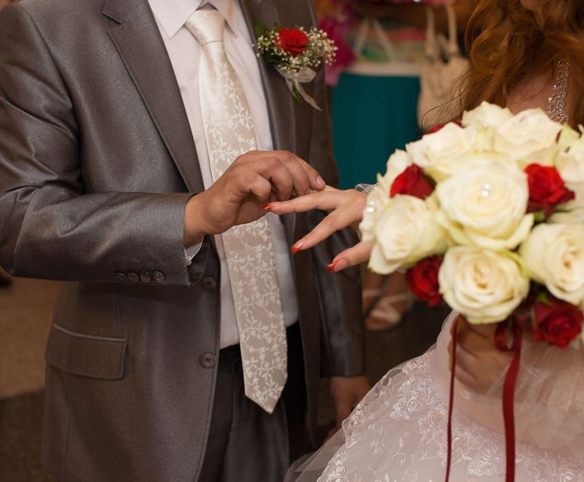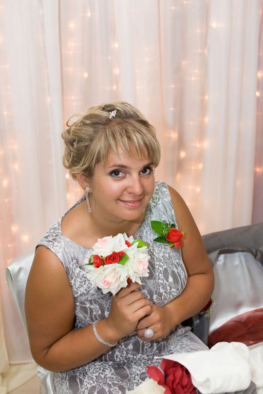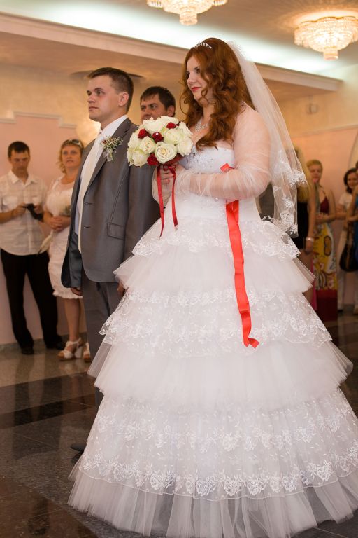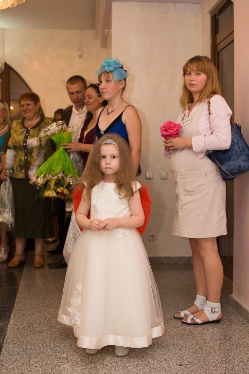 Закончили со съемкой показались гостям спускаемся и о ужас машины стоят «пустые» я была в шоке столько народа, а нарядить было некому (свидетельница была постоянно со мной и помогала мне во всём)… Ехали мы в ЗАГС совершено незаметные… Всё время я ныла и жаловалась на происходящее, ещё как на зло у нас глохла машина во время движения из-за проблем с электроникой… Приехав в ЗАГС мне говорят что мои родственники ещё не приехали причину уже не помню… Напряжение нарастает и мои нервы начали сдавать, я чуть не разревелась, но смогла себя сдержать…пришел Митя для съемки репортажа мне было тяжело сосредоточиться и собрать свои мысли в кучу… Наконец приехали мои гости привели моих детей, начали одевать моему старшему ангелочку крылышки и через несколько минут нас пригласили в актовый зал… Как ни странно, но сам процесс после того как мы вошли я смутно помню наверное сказалось волнение, помню что старалась сделать всё как просили Митя и Таня не спеша…. После актового зала мы сделали несколько снимков и нас пригласили в зал шампанского где прозвучало несколько тостов и поздравлений... Как там было хорошо что на улицу даже выходить не хотелось… Мы вышли населись по машинам и часть гостей поехала с нами, а часть по домам в ожидании банкета…