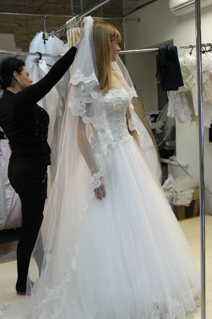 Ла Феста. Платье №1. ОЧЕНЬ хорошо! Нежное, воздушное, для принцессы! Золоченая вышивка подходит под цвет твоих волос и делает платье интересным. Пышная фатиновая юбка придает легкости. С фатой-испанкой так вообще ты в нем - полностью готовая невеста!