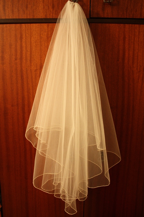 Значится, фотоотчет: фата больше белого, чем кремового цвета, но обработанные края такие какие нужно по виду и цвету. Двухслойная, фатин мягкий. Я меряла и пожестче, но она была не такая нежная, слишком стоячая и немного пошлая.