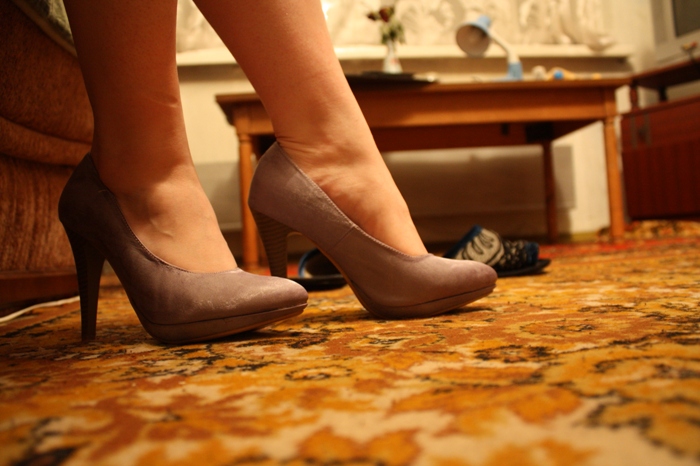 Туфли - лиловые, какой-то тканевый материал. На фото цвет передан отвратно, он каким-то серым кажется, со вспышкой не лучше. На деле они светлее и красивее. Вроде бы удобные, по разносить надо. Каблук средней длины, не очень высокий.