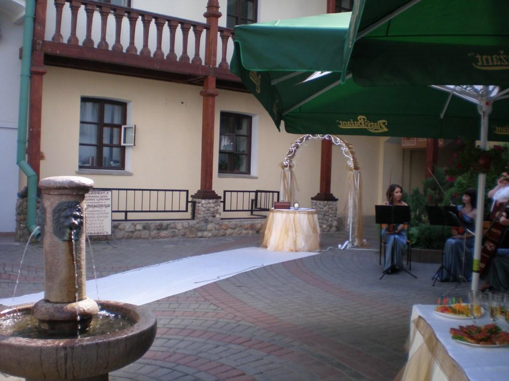 нас пригласили к 16.00 на выездную роспись, которая была во дворике на Немиге кафе Фердь, (там же был небольшой фантанчик) там стояла арка для регистрации, столик, , стол под навесом с шампанским и закусками, (украшениие в стиле Elfiro) тетя-регистраторша читала стихи и самое классное - это 3 девушки, которые играли на скрипках и контрабасе в длинным стального цвета шелковых платьях (регистрация была не под марш Мельдельсона)