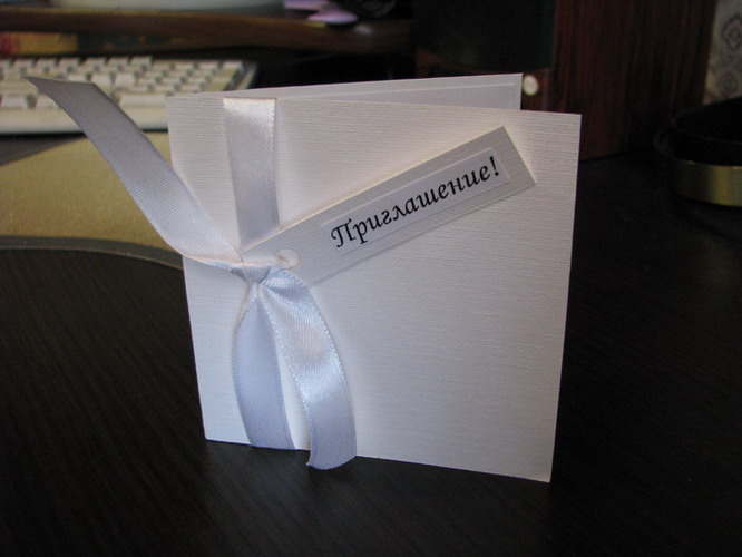 Побывала сегодня на свадебной выставке.  Ничего толком не насмотрела. Единственное, с чем я оттуда ушла - с двумя искусственными бутоньерками для свидетелей и с целой макулатурой визиток.  А ещё я забрала сегодня свои приглосики! Они такие, как я и хотела: простенькие и симпатичные. Текст для них я сама в фотошопе выделывала.  Хочу ещё на лицевой стороне каждого приглосика (в правом нижнем углу) написать от руки нашу дату (чёрной гелиевой ручкой). В общем, вот, выставляю вам на обозрение.