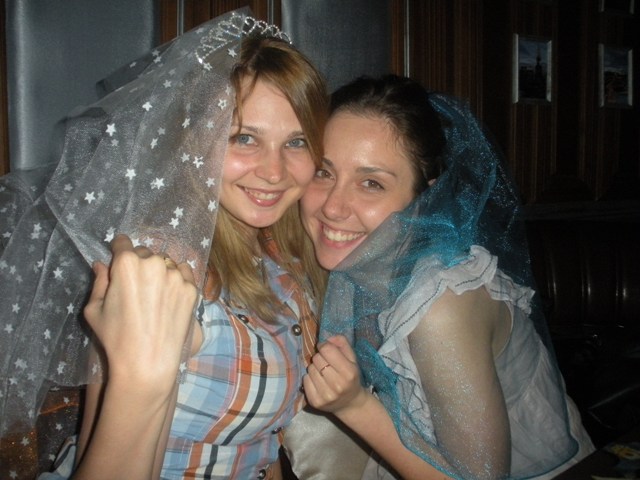 Ах, да! Чуть не забыла одно из главных "СПАСИБ" моим девочкам, которые устроили мне девичник! Дело в том, что моя подготовка проходила очень нервно и очень загруженно, я просто физически не успевала сделать такой девичник, который хотела изначально, хотя даже оставила на это средства. Хотела заказать лимузин, накупила разноцветного фатина, шампанского... Но времени оказалось гораздо меньше, чем денег. В итоге в среду, за 2 дня до свадбы созваниваюсь с подругами. Время - 6 вечера, мы едем с какой-то очередной важной встречи с подрядчиками, будний день, завтра всем на работу. Я понимаю, что все срывается, сижу кислая, и Ванька, видя это все, принимает волевое решение: "Так, быстро собирайся, обзвони всех, кто сможет приехать, я тебя отвезу, а потом развезу вас всех, пьяных, по домам". Я в срочном порядке собираться, в машине дошиваю фату, выдергиваю всех, кто сможет приехать в клуб к 8. Собрались в итоге не все - только трое, но зато самые веселые  Наша подруга - арт-директор в клубе "Центр". Поэтому выбор пал на караоке-клуб. Да так удачно пал, что мы еще после свадьбы с друзьями там уже третий вечер зависаем, а завтра идем туда смотреть футбол! В общем, перепели мы все, что видели и знали, но это было не главное событие. Где-то в середине вечера подруга берет микрофон и вызывает меня на сцену... В общем, моя девочка подарила мне стриптизера!) Ну что сказать - я была в восторге! Ну а вы бы не были?)
