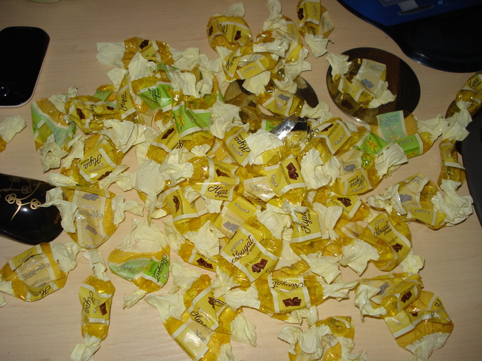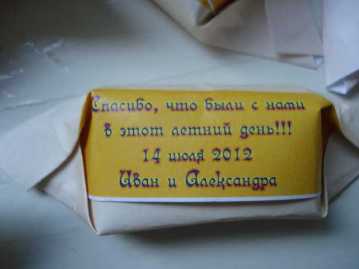 Выкладываю фотки своих последних трудов. Сегодня просто капец как замоталась, БМ уехал по делам на целый день, да еще и с машиной, а моя с дырой в глушителе, не езжу на ней щас. Пришлось мне без него и без машинок, все самой. Ходила докупала кое-какие продукты на рынок к столу, сгоняла в универ по поводу перераспреда, там изрядно потрепала себе и другим нервы и потеряла кучу времени, в итоге еще придется завтра или вообще послезавтра идти  Ленивый бюрократы!!!!! Заказала загсовского фотографа. 250 тыс за работу. Отдает все фотки на диске+14 распечатанных фоток 15х21. Теперь, думаю, в загсе не будут дурить голову моему фотографу, цепляться, требовать паспорт и мешать работать. Завернула конфеты. Получились бонбонки.