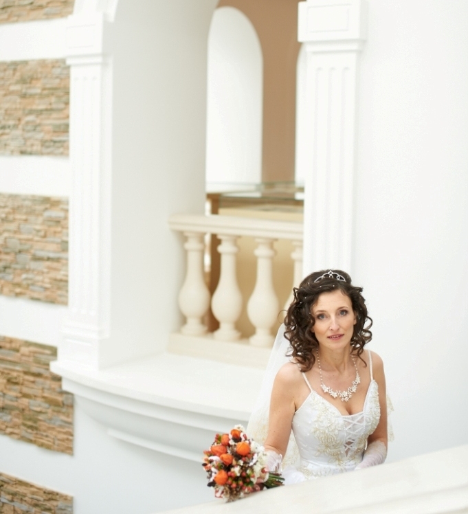 Нас уже заждались в кафе «София». Звонили, спрашивали, когда с хлебом-солью выходить. И вот в 16-30 мы в кафе. Нас встречали брат жениха с женой. А также все мои любимые друзья и гости. Кафе «София» меня поразило. Все оказалось очень вкусно приготовлено. Еды осталось очень много. Ели на второй день на венчание и еще потом два дня. Банкетный зал рассчитан на 30 человек, но можно было влезть и 35. Нас было 22. Заплатили мы за зал 7,5 млн. руб. без спиртного и фруктов. Зал не требует специальных украшений. В нем красивые шторы, декорированные диванчики, камин. Мои гости поехали заранее, украсили зал немного шариками, цветами и свадебным плакатом, который я купила в книжном. Так как мое платье и фата были украшены золотистой вышивкой, то и шары я взяла золотисто-белые. А также бокалы и салфетки подобрала в этом тоне. Поэтому только могу выразить благодарность всем работникам этого кафе, а также за подарок, который они нам предоставили: три зажигательных танца (варьете, народный и канкан). И все это бесплатно. А еще хорошая живая музыка – дуэт. Также торт Симфония с хлебозавода оказался довольно-таки неплохим. На вкус похож на киевский.