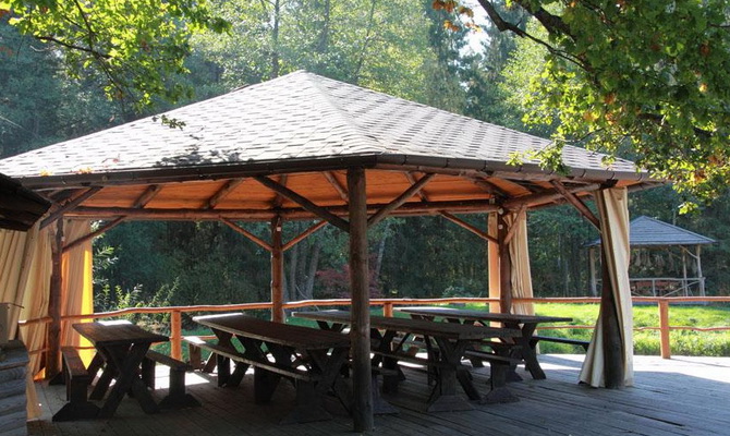 Нашла еще усадьбу Терраски, там есть беседка, но совсем уж небольшая. И увидела еще тент, но про него нигде ничего не написано.. Нужно съездить посмотреть, и недалеко от города особо, только интерьер не очень, но есть и красивые места)