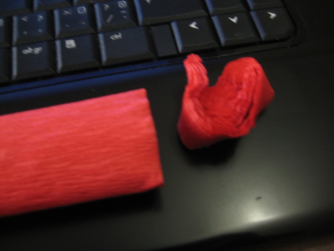 veronika nik, сразу оговорюсь, что идея с сердечком не моя - это Ларишка наша мега-выдумщица его изобрела)))))))) а я злостный тырильщик я попытаюсь на словах тебе объяснить, а если не будет понятно, то перейдем к мастер-классу с фото 1) вырезаем сердечко из картона(я брала коробку из-под обуви) 2)берем шпажку и обклеиваем красной креповой бумагой 3) шпажку(уже подсохшую) приклеиваем к сердечку(я клеила двухсторонним скотчем) 4)вырезаем из креповой бумаги сердечко на 1,5 см больше, чем из картона (я прикладывала сердце из картона к креп.бумаге и обводила с запасом на 1,5 см)- это для того, чтоб, когда будешь приклеивать эти 1,5 см загнуть на другую сторону сердца и краешек получился аккуратным. 5)таким же образом вырезаем из креп.бумаги сердце на 5-7 мм меньше, чем картонное. это для того, чтоб приклеить его на обратную сторону сердца) 6)дальше это всё дело приклеиваем к картону: сначала большое и края загибаем на обратную сторону. а затем приклеиваем маленькое)) и у тебя должно получится красное сердце на палочке)))) 7) берем рулон креп.бумаги и не разворачивая его, разрезаем на кусочки шириной 1,5-1,7 см. затем скручиваем их в маленькие, крепенькие рулончики