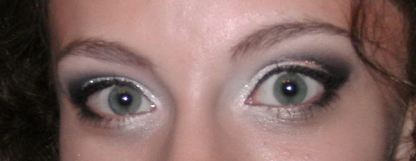 Один глаз просто с серебряными блестками, а второй еще с персиковым цветом.