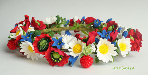 tato4ka, полимерная глина - это не глина в обычном нашем понимании)))) Цветы из нее очень легкие и тоненькие, чем-то даже материал бумагу напоминает. Но тем не менее стойкие и не хрупкие. Венок из полимерной глины будет не тяжелее такого же венка из натуральных цветов.