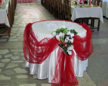 Украшение зала выбирала одна: посмотрев множество вариантов выбрала вот такой в красно-белой гамме. Столы будут украшены тканями и цветами, гелиевые шары под потолок и обычные шары в зане для танцев на полу.