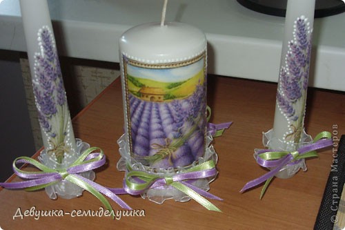 В общем, любимый мой рулит). Вчера нашел видеографа нам, а сегодня лаванду сушеную для пригласительных). А я калека только болеть и могу...  Решили остановиться на Александре Карпенко. Любимому понравился, я решила довериться. Посмотрела его работы в ВК - вряд ли он что-то ужасное сотворит с нашим видео. Клипы хорошие, динамичные. Ну а то от чего я испытываю прям эстетическое наслаждение стоит не меньше 500. Так что, надеюсь, все будет добре. Я тут начала ломать голову над хэндмэйдом. Хочу пригласительные с использованием сухоцветов (лаванды).  А в качествое бонбонок и рассадочных карточек положить на тарелочку ажурную салфеточку, а на салфеточку упакованное прозрачной пленкой фиолетовое мыло с запахом лаванды и лавандовыми сухоцветами, перевязанное ленточкой с висящим на ней тэгом с именем гостя.  Ну и свечи тогда обыграю в лавандовой тематике. Это может быть декупаж:  Или сухоцветы:  Ну и шампанское задекупажить для коллекции: