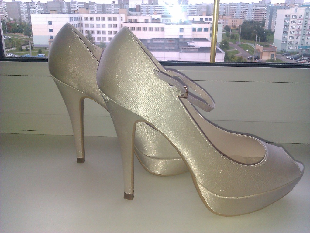 Туфли свадебные. Покупала в Киеве для себя, но в последний момент решила, что для моего образа больше подойдут блестящие, а не белые Туфли полностью новые, в коробке. Мерила только в магазине и дома. Даже ценники не отклеила! Марка: New Look (Великобритания). Вот сайт марки: http://www.newlook.com/ Материал: сатин и искусственная кожа. Высота каблука: 12 см (включая платформу). Закрытая пятка, открытый носок, перемычка. Цвет: белый. Размер: маркировка UK 6, EU 39, но я ношу 38 размер, мне, как раз впору. Куплены за 33 евро (примерно 42$). Отдаю за 35$!