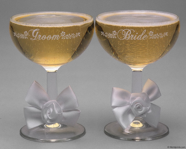 Буквы если честно мне и так нравятся, без украшений. А ты их ставить будешь на стол или вешать на ткань снизу? А бокалы интересные, но сложные для украшения. Мне кажется на них хорошо будет смотреться роспись, гравировка либо украшения стразами, полубусинками. Цветочки или бантики на ножку не повесишь, будут смотреться сиротливо, кружево будет плошо держаться и топорщится. Варианты на картинках не совсем твои, но как идея надписей и прочих украшений
