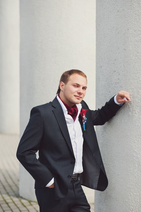 Около 10 утра поступил сигнальный звонок от свекрови - жди, Леша и свидетель выехали. А я еще в халате по дому разгуливаю. Стали срочно и экстренно влезать в платье, оказалось что шлейки откровенно длинные (меряйте платье когда забираете его!) Вопреки всем приметам шлейки пришивали прям на ходу - ну а что делать-то было. Не успели, милый прибыл раньше чем усадили меня в платье. Дабы сгладить неловкую паузу в сборах, папа налил мальчишкам коньячка, а Мила отправилась фотографировать мужскую красоту)