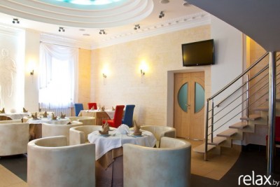Вот фотографии нашего интерьера в ресторане. Единственная проблема - это огромный спортсмен на стене, около которой мы хотим поставить стол молодых. Сейчас ведм переговоры с оформителями, чтобы данного объекта спрятать на время торжества)