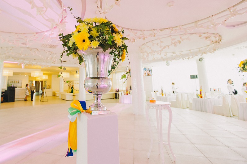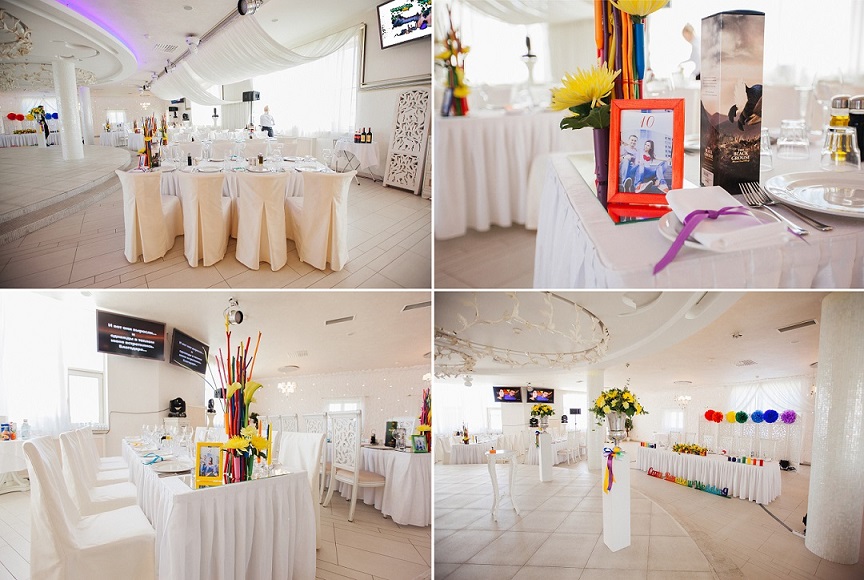 Да, эта статья- единственное, что меня немного огорчало, тк изначально вообще цена была озвучена 4 с хвостиком тыс$. Ведь многое еще зависит от кол-ва человек: больше людей- больше столов, больше салфеток и тд. Я уже сокращала все пункты, как могла. Мне понравились Надины и Настины идеи, хотелось чего-то вот такого нестандартного. Не просто цветов в вазах, которые мне предлагали в остальных студиях декора. К сожалению пока нет других фото, но на террасе еще были задекорированы цветами 3 наших больших плаката. А фото-зону, может я неправильно выразилась, делали не мы, а декораторы тоже. Мы лишь привезли свой реквизит (шапки разные, очки, муз.инструменты и тд.). Ну и как обычно бывает, только при безграничном бюджете люди могут все пункты мероприятия организовать по максимуму. Если все же определил себе конкретный бюджет и пытаешься в него влезть, но не совсем получается, начинаешь сокращать наименее важные (на собственный взгляд) пункты. Не то, чтобы декор для нас был не важен, но просто сам этот Белый зал вполне самодостаточный и не хотелось его сильно перегружать. Вот еще немного фото:
