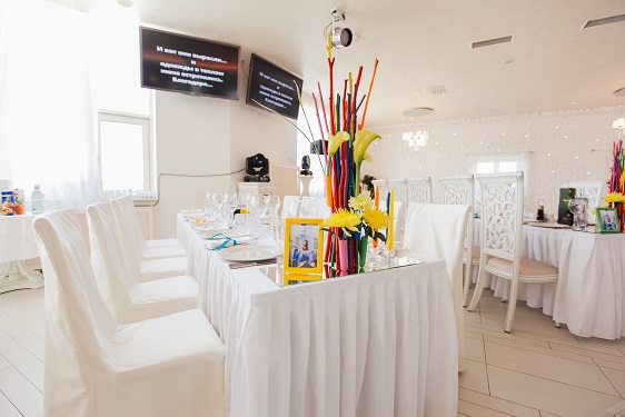 Да, эта статья- единственное, что меня немного огорчало, тк изначально вообще цена была озвучена 4 с хвостиком тыс$. Ведь многое еще зависит от кол-ва человек: больше людей- больше столов, больше салфеток и тд. Я уже сокращала все пункты, как могла. Мне понравились Надины и Настины идеи, хотелось чего-то вот такого нестандартного. Не просто цветов в вазах, которые мне предлагали в остальных студиях декора. К сожалению пока нет других фото, но на террасе еще были задекорированы цветами 3 наших больших плаката. А фото-зону, может я неправильно выразилась, делали не мы, а декораторы тоже. Мы лишь привезли свой реквизит (шапки разные, очки, муз.инструменты и тд.). Ну и как обычно бывает, только при безграничном бюджете люди могут все пункты мероприятия организовать по максимуму. Если все же определил себе конкретный бюджет и пытаешься в него влезть, но не совсем получается, начинаешь сокращать наименее важные (на собственный взгляд) пункты. Не то, чтобы декор для нас был не важен, но просто сам этот Белый зал вполне самодостаточный и не хотелось его сильно перегружать. Вот еще немного фото: