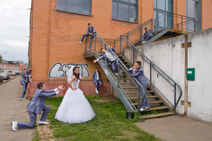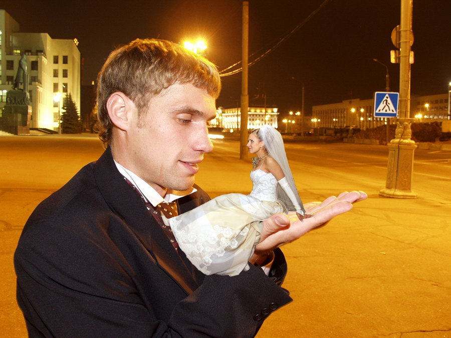 все остались довольны А вообще "невестам на ладошке" и т.п. штампы будут, они будут менять друг друга, и N-е поколение будет считать моветоном фотаться на фоне ядерного взрыва или в обнимку с пришельцем возле ратуши. Например я попробовал один трюк на свадьбе, причем не новый. Ребятам понравилось. Его окрестили "матрица" и далее те кто видели этот снимок, то же хотели "матрицу" в своем свадебном портфолио. вот как это выглядит Вложение: